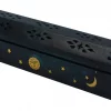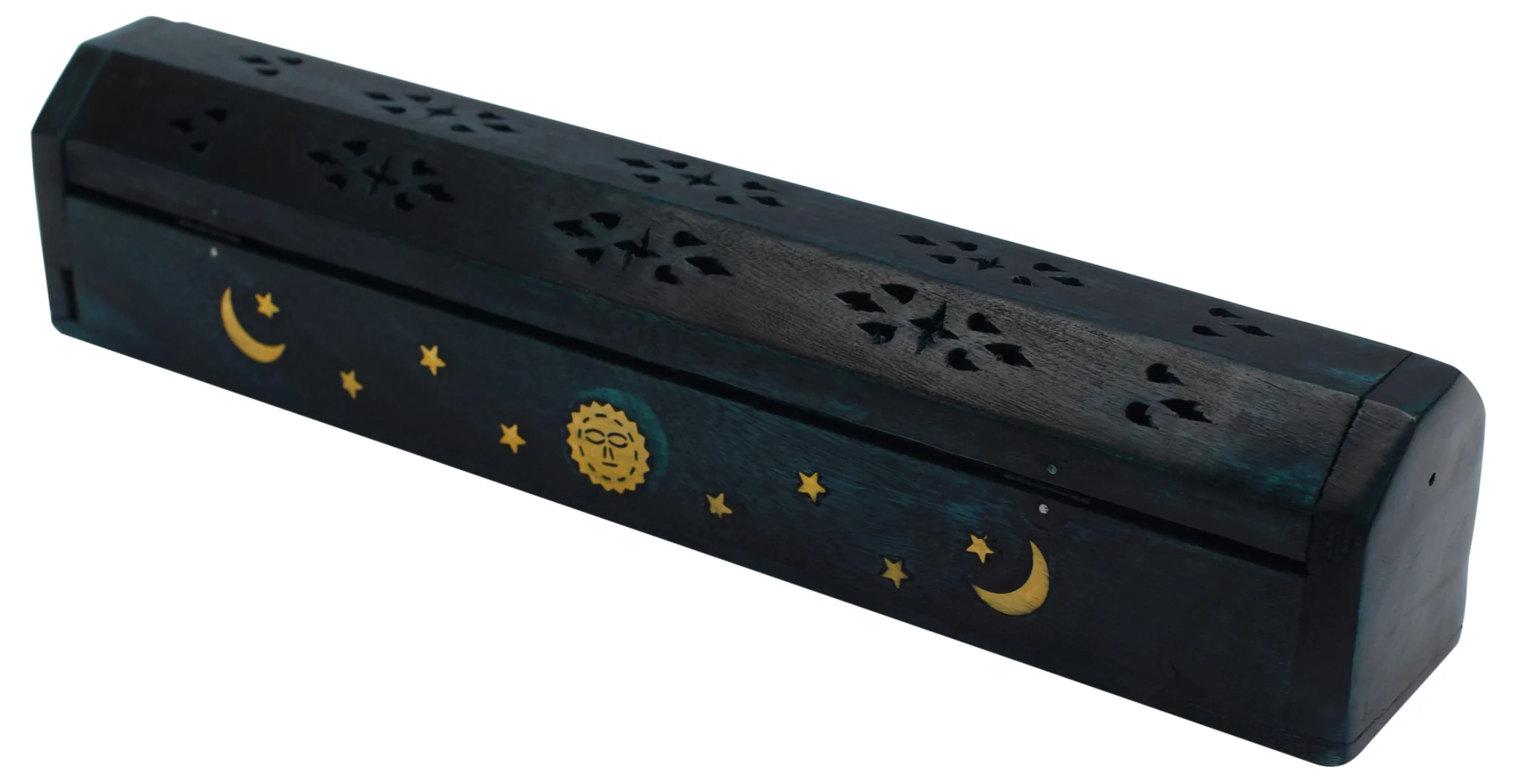 Sun, Moon, and Stars Brass Inlay Design Black – Wooden Coffin Incense Burner for Incense Sticks and Cones